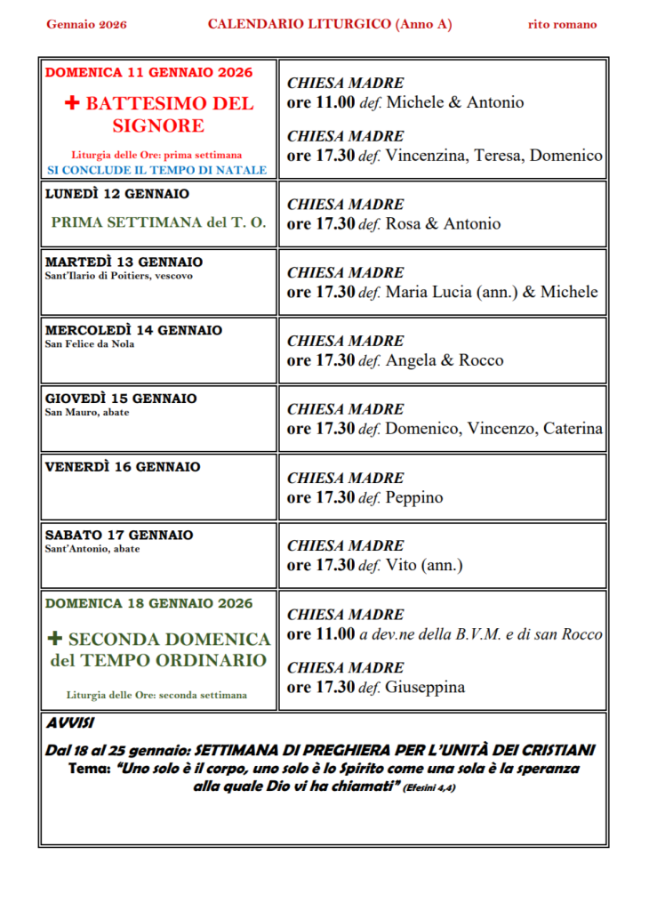 Calendario Liturgico 11 – 18 Gennaio 2026